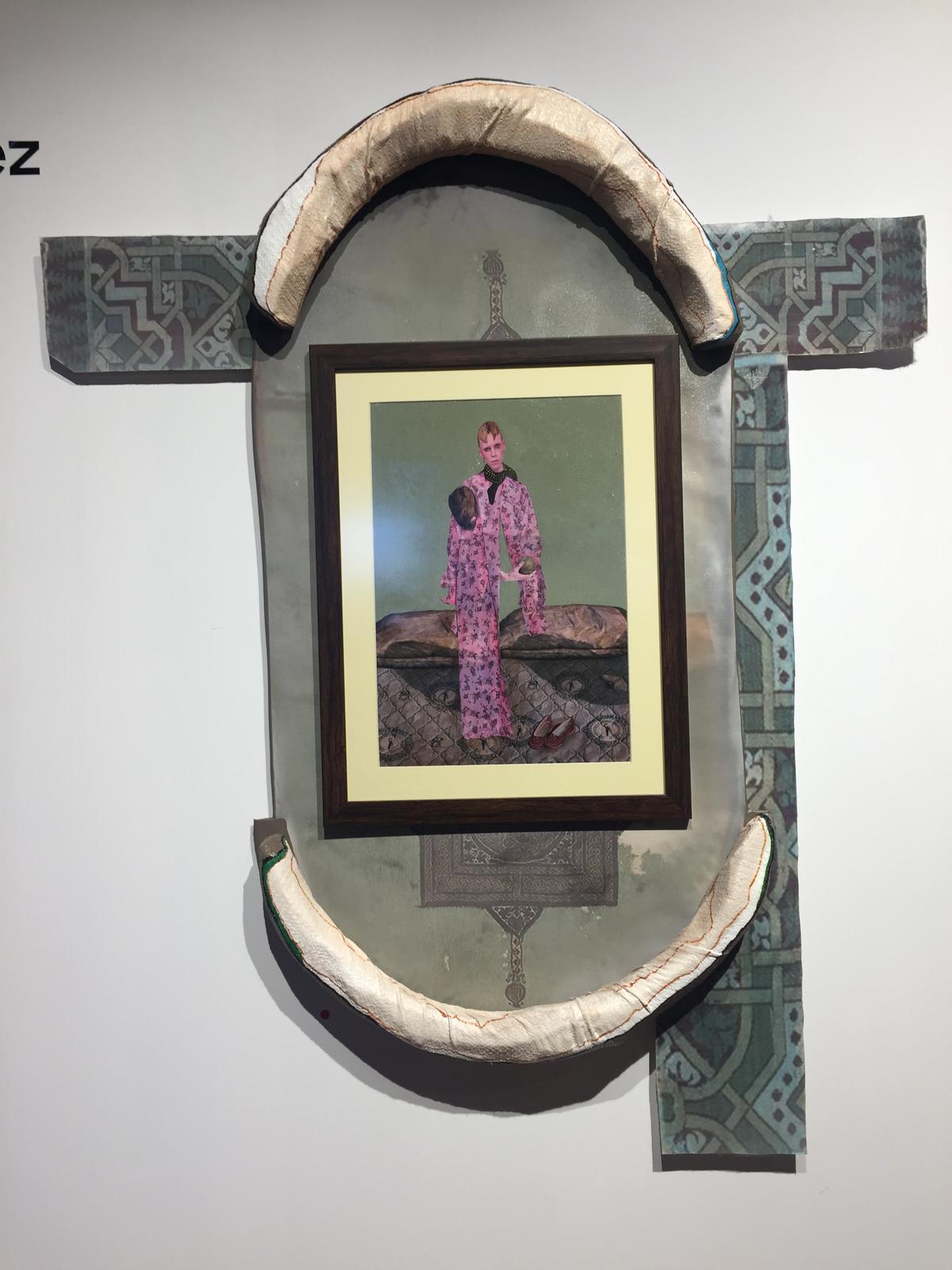 Sanatçının adını tam hatırlayamıdığım bu eser de bana yakın gelenler arasındaydı. Cinsiyet, kültür ve aidiyet üçgeni bağlamında değerlendirildiğinde, kişinin kopamadığı ve yaşamı süresince peşinden ardı sıra gelen bu kavramların içinde ya boğulup çıkmaza düşeceği ya da bütünleşip bir uyuma kavuşacağını bence anlatmak istiyor bize. Sağ alttaki ayakkabı ve entariye benzeyen elbise bizle doğal bir yakınlık kuruyor ve içinde olan kişiden bağımsız tutarak veya tutmayarak bizimle iletişim kurmak istiyor bir nevi.