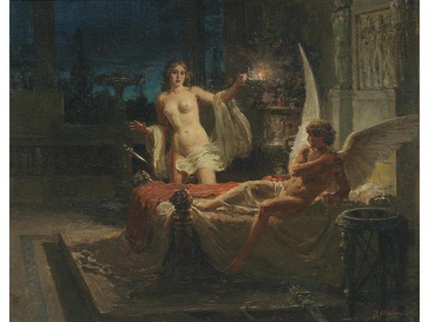 Psyche dağa çıktığında, rüzgarlarının tanrısı Zephyrus onu göğe uçurur ve nazikçe bir koruluğa bırakır. Gözlerini yeni sarayında açan Psyche eşi Eros ile burada yaşar. Ancak Eros diğer tanrıların bile ondan korktuğu bir tanrıdır. Korkunçtur. Yani herkesin onun hakkında böyle düşünmesi onu buna inandırmıştır. Eros Psyche’ye kendi iyiliği için ona hiç bakmaması gerektiğini söyler ve bunun için söz verdirir. Psyche gündüz yalnız, geceleri ise yüzünü hiç görmediği eşi Eros ile birliktedir. Bir gün kız kardeşlerinin dolduruşuna gelen Psyche, Eros'un yüzünü görmek için yanına gizlice girer. Eros'un yüzünü gören Psyche onun güzelliğini büyüleyici bulur. Bu heyecanla yanlışlıkla Eros'a yakalanır. Bu ihanet karşısında kendini çok kötü hisseden Eros sarayı terk eder.