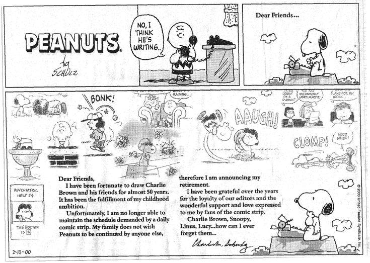 12 Şubat 2000'de hayata gözlerini yuman Schulz hastalığı nedeni ile emekli olacağını açıkladığı son karikatür köşesini hazırlamıştı. Kaderin cilvesi mi dersiniz bilemiyorum, hazırladığı son köşe öldüğü günün ertesi günü yayınlanmak üzere planlanmıştı. Böylelikle dünya, hem Charles Schulz'a hem de Peanuts'a peş peşe veda etmiş oldu.