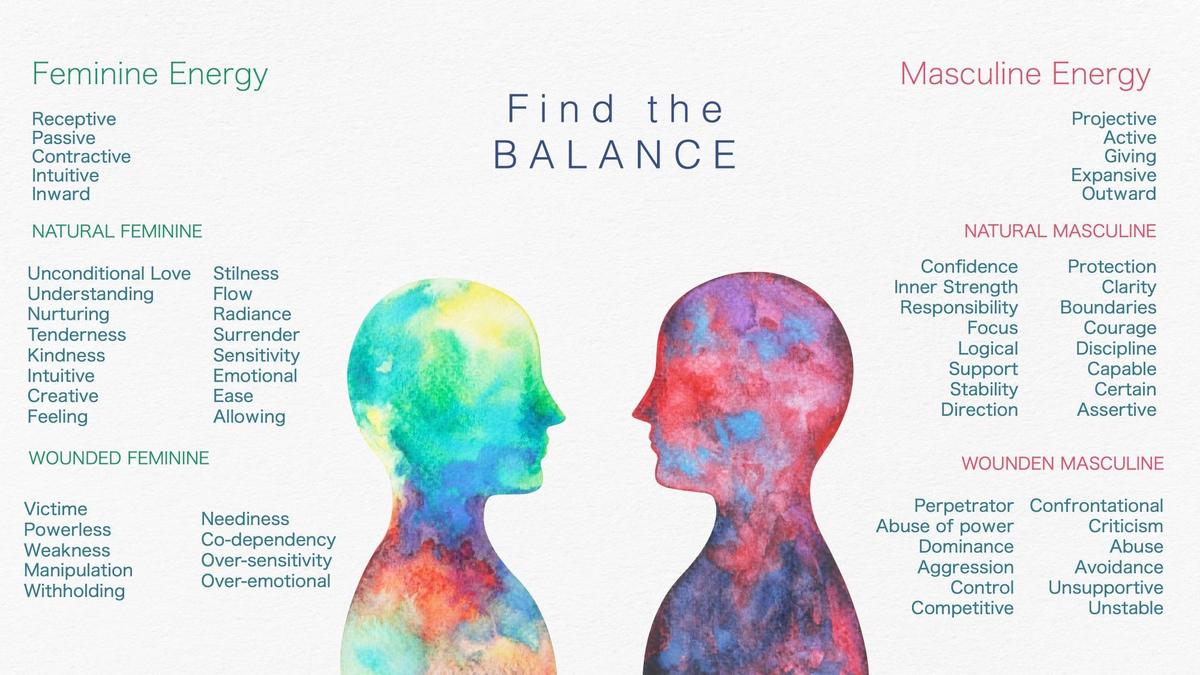 Maskülen ve feminen enerjinin insanın cinsiyet kimliği ile alakası yoktur. Her insanın maskülen ve feminen enerjisi vardır. Bu enerjiler bizim dengeli yaşamamızı sağlar. Tıpkı ak olmadan karanın olamayacağı, iyilik olmadan kötülük olamayacağı gibi enerjisel dengemiz için de düaliteye ihtiyacımız vardır. Nasıl giyindiğiniz, konuşma şekliniz, oturup kalkışınız, dış görünüşünüz gibi faktörlerin bu enerjilerle alakası yoktur. Söylediğim gibi olay, enerji ile alakalıdır. Feminen enerji işbirlikçidir, maskülen enerji bağımsız ve rekabetçidir. Maskülen enerji plan yapar; feminen enerji serbest bırakır, akışa teslim olur. Maskülen enerji vericidir, feminen enerji alıcıdır. Maskülen enerji koruyucudur, feminen enerji iyileştiricidir. Maskülen enerji yapılandırıcıdır, feminen enerji yaratıcıdır.