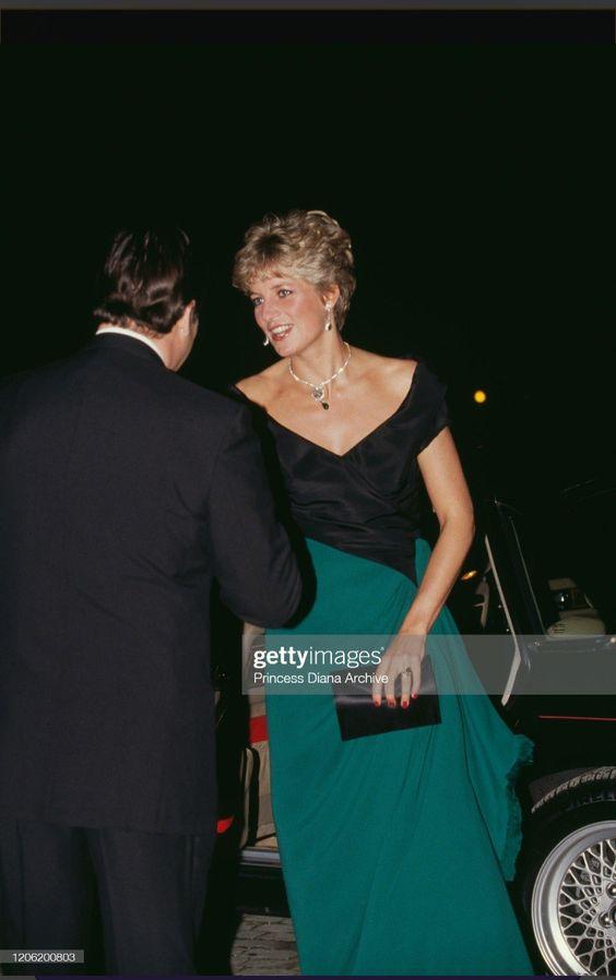 En az bilinen ve en sevdiklerimden başlamak istiyorum. Diana bu saks mavi ve siyah rengin uyumunu ortaya çıkaran Bruce Oldfield elbisesini 1985'te İtalya'da Venedik kentine yaptığı bir gezi sırasında giydi. 1980'li yıllarda Colour Block tarzını benimsediğini birkaç kıyafetiyle bizlere gösteriyor. 80'lerin modasına uyarak daha çok vatkalı ve maxi veya midi boy elbiseleri tercih ederken asaleti de tüm bu unsurlarla birleştiriyor. Görünümünü maximallikten uzak durarak sade ayakkabı ve aksesuarlarla tamamlıyor.