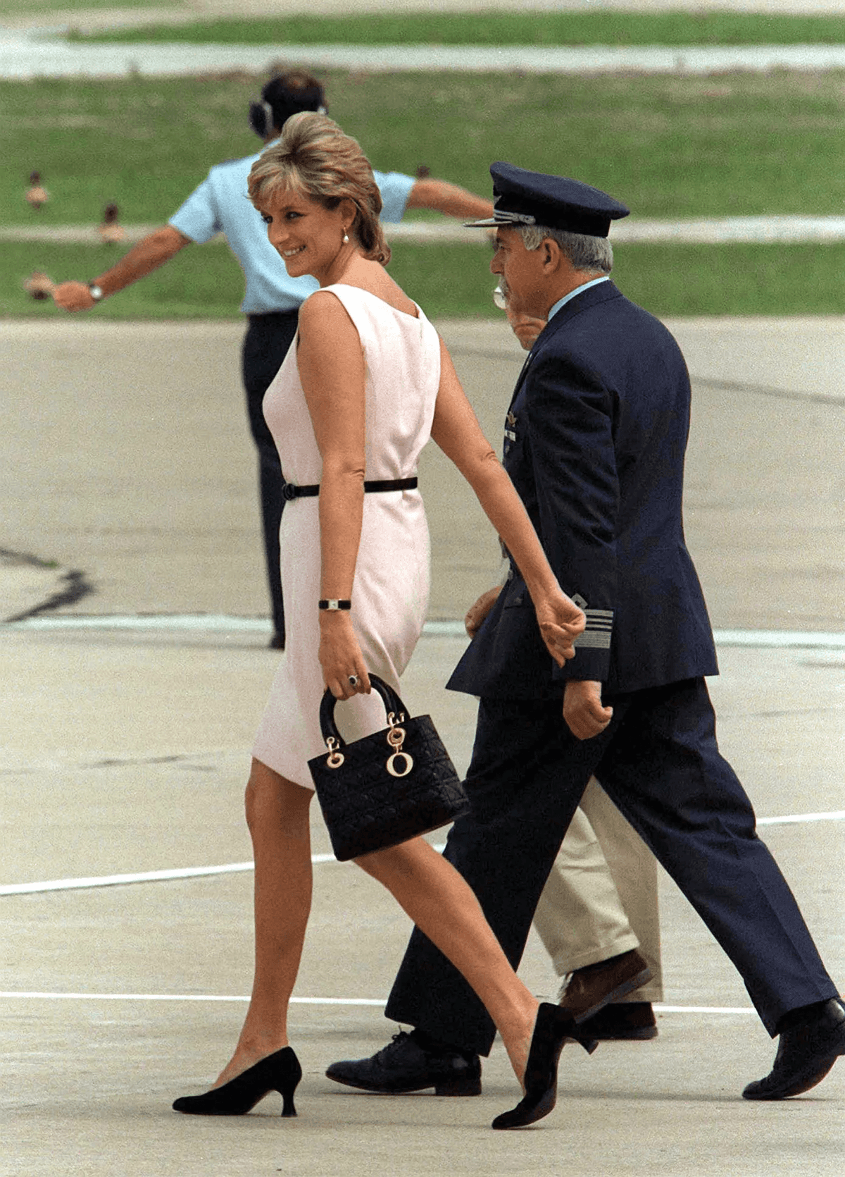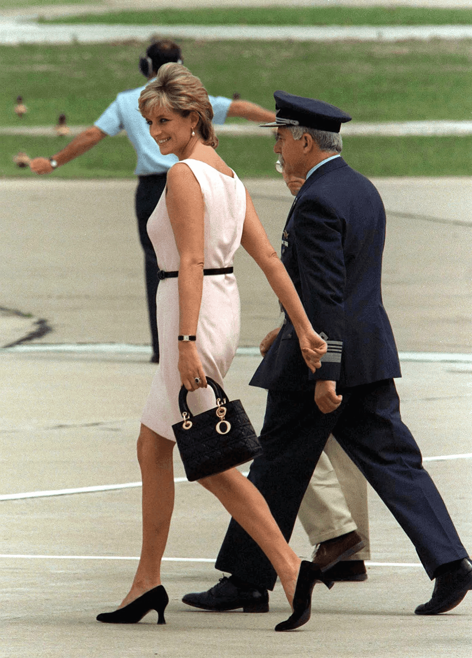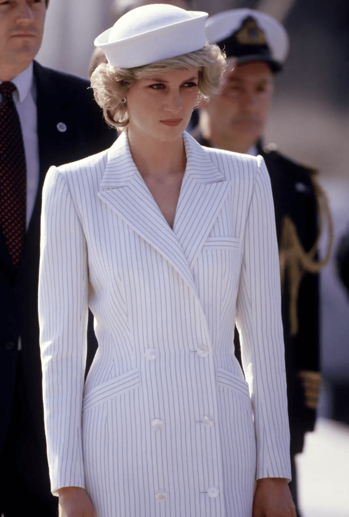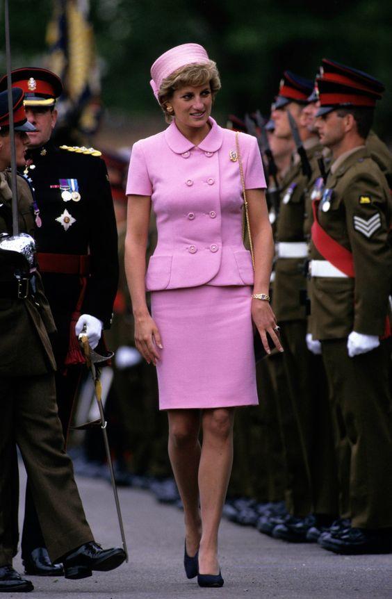 Diana sıklıkla gittiği resepsiyonlarda şık takımlar ve döpiyesler tercih ederdi. Bunların çoğunun ortak özelliği 2024 yılında da fenomen olan çizgi desenli olmalarıydı. Yatay ve dikey çizgilere sahip kombinleriyle oldukça asil bir görünüm yakalayan Diana 1985 yılında bir deniz üssünü ziyaret ederken, yukarıdaki benim de çok sevdiğim bir görünüm olan Catherine Walker tasarımı ince çizgili bir elbise tercih etti ve kırık beyaz bir şapka ile eşleştirdi.