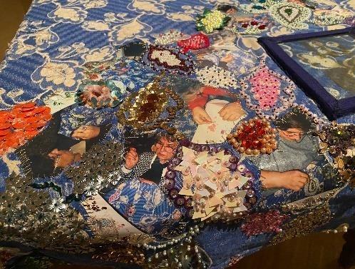 Benim sergiyi gezemeyi sonlandırırken en çok incelediğim "Annemin Gösterisi" adlı çalışma oldu. İlk başta sıradan bir masa karşınıza çıkıyor ve yaklaştığınızda masa örtüsünün dikiliş biçimini, bir araya gelen renkleri, süreçteki fotoğrafları görüyorsunuz. Boncukları, renkleri, tüm ayrıntıları çok sevdim. Bir yandan fotoğraflara bakmak fazlasıyla eğlenceliydi. Yüzümde bir gülümseme oluştuğunu fark ettim. Bu çalışmanın sanatçısı Börüteçene'nin annesi Hesna Hanım tarafından yapılıp Handan Börüteçene tarafından da uygulamaya geçirilmiş.