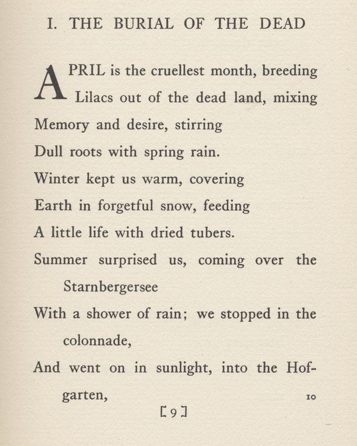 The poem includes lots of allusions to Dante, Chaucer, and others. “For Ezra Pound/ il miglior fabbro.(2) We also see many different voices. All of them are modernist poetry features.