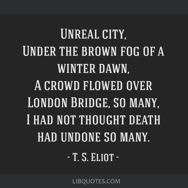 “Under the brown fog of a winter dawn”(64). Fog is a symbol in modern poetry meaning something covers. People do not see and look at each other anymore like neither dead nor alive.