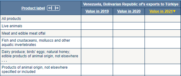 Venezuella'da ithal edilen ilk beş sıraya baktığımızda; (1)Canlı hayvanlar, (2)Et ve yenilen sakatat, (3)Balık ve kabuklular, yumuşakçalar ve diğer suda yaşayan omurgasızlar, (4)Süt ürünleri; kuş yumurtaları; doğal bal; hayvansal kökenli yenilebilir ürünler, başka yerde sınıflandırılmamış, (5)Hayvansal kökenli ürünler, başka yerde belirtilmeyen veya yer almayan ürünleri görüyoruz.