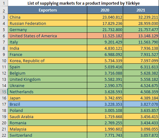 Asya Ülkeleri; sarı, Avrupa Ülkeleri; yeşil, Kuzey Amerika Ülkeleri; turuncu, ve son olrak Güney Amerika Ülkeleri; mavi renk ile işaretlenmiş. En çok ithalat yapılan ülkeler arasında Çin birinci sırada yer alırken, Rusya'yı ikinci, Almanya'yı da üçüncü sırada görüyoruz. Kıtalara göre incelediğimizde; Avrupa ülkelerinden en çok Almanya, İtalya, Fransa, İspanya ve Belçika ile en çok ithalat gerçekleştirilmiş. Asya ülkelerine baktığımızda en çok Çin, Rusya; Hindistan, Güney Kore, ve Japonya ile ithalatın gerçekleştirildiğini görüyoruz. Afrika ülkerinde ise sıralama; Mısır, Cezayir, Güney Afrika, Fas ve Libya olarak önümüze çıkıyor. Kuzey ve Güney Afrika ülkelerinden, ABD, Kanada, Meksika, Brezilya, Kolombiya, Venezuella,Arjantina ve Şili'ni en çok ithalat yapılan ülkeler olduğunu görüyoruz. Avustralya Kıtasında ise en çok ithalat Avustralya ile yapılıyor.