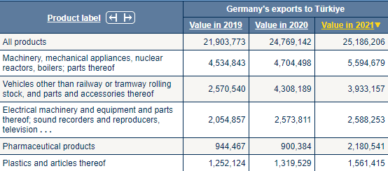 Almanya'dan ithal edilen ilk beş sıraya baktığımızda; (1) makineler, mekanik cihazlar, nükleer reaktörler, kazanlar; parçalar, (2) demiryolu veya tramvay vagonları dışındaki araçlar ve bunların parça ve aksesuarları, (3) elektrikli makine ve teçhizat ve bunların aksam ve parçaları; ses kaydediciler ve çoğaltıcılar, televizyon, (4) eczacılıkla ilgili ürünler, (5) plastikler ve bunlardan mamul eşya ürünlerini görüyoruz.