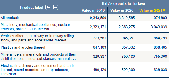 İtalyadan ithal edilen ilk beş sıraya baktığımızda; (1) Makineler, mekanik cihazlar, nükleer reaktörler, kazanlar; parçaları, (2) Demiryolu veya tramvay vagonları dışındaki araçlar ve bunların parça ve aksesuarları, (3) Plastikler ve bunlardan mamul eşya, (4) Mineral yakıtlar, mineral yağlar ve bunların damıtılmasından elde edilen ürünler; bitümlü maddeler; mineral, (5) Elektrikli makine ve teçhizat ve bunların aksam ve parçaları; ses kaydediciler ve çoğaltıcılar, televizyon ürünlerini görüyoruz.