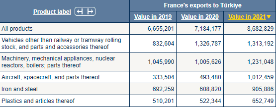Fransa'dan ithal edilen ilk beş sıraya baktığımızda;(1) Demiryolu veya tramvay vagonları dışındaki araçlar ve bunların aksam ve parçaları, (2) Makineler, mekanik cihazlar, nükleer reaktörler, kazanlar; bunların parçaları, (3) Uçak, uzay aracı ve bunların parçaları, (4) Demir ve çelik,(5) Plastikler ve bunlardan mamul eşya ürünlerini görüyoruz.