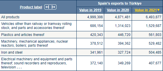İspanya'dan ithal edilen ilk beş sıraya baktığımızda; (1) demiryolu veya tramvay vagonları dışındaki araçlar ve bunların aksam ve parçaları, (2) plastikler ve bunlardan mamul eşya, (3) makineler, mekanik cihazlar, nükleer reaktörler, kazanlar; bunların aksam ve parçaları, (4) demir ve çelik, Elektrikli makine ve teçhizat ve bunların aksam ve parçaları; (5) ses kaydediciler ve çoğaltıcılar, televizyon ürünlerini görüyoruz.