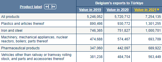 Belçika'dan ithal edilen ilk beş sıraya baktığımızda; (1) plastikler ve bunlardan mamul eşya, (2) demir ve çelik, (3) makineler, mekanik cihazlar, nükleer reaktörler, kazanlar; bunların aksam ve parçaları, (4) eczacılık ürünleri, (5) demiryolu veya tramvay vagonları dışındaki araçlar ve bunların aksam ve parçalarını görüyoruz.