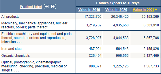 Çin'den ithal edilen ilk beş sıraya baktığımızda; (1) makineler, mekanik cihazlar, nükleer reaktörler, kazanlar; bunların aksam ve parçaları, (2) elektrikli makine ve teçhizat ve bunların aksam ve parçaları; ses kaydediciler ve çoğaltıcılar, televizyon, (3) demir ve çelik, (4) organik kimyasallar, (5) optik, fotoğrafik, sinematografik, ölçme, kontrol, hassas, tıbbi veya cerrahi ürünlerini görüyoruz.
