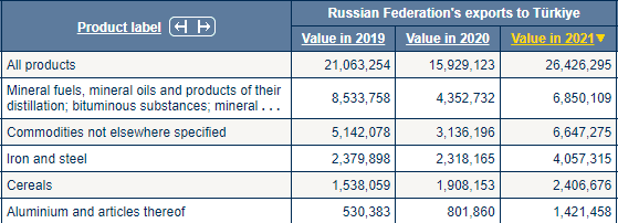 Rusya'dan ithal edilen ilk beş sıraya baktığımızda; (1) mineral yakıtlar, mineral yağlar ve bunların damıtılmasından elde edilen ürünler; bitümlü maddeler; mineral, (2)başka yerde belirtilmeyen emtialar, (3) demir ve çelik, (4) hububat, (5) alüminyum ve bunlardan mamul eşyaları görüyoruz.
