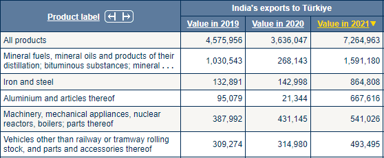 Hindistan'dan ithal edilen ilk beş sıraya baktığımızda; (1) mineral yakıtlar, mineral yağlar ve bunların damıtılmasından elde edilen ürünler; bitümlü maddeler; mineral, (2) demir ve çelik, (3) alüminyum ve bunlardan mamul ürünler, (4) makineler, mekanik cihazlar, nükleer reaktörler, kazanlar; bunların aksam ve parçaları, (5) demiryolu veya tramvay vagonları dışındaki araçlar ve bunların aksam ve parçalarını görüyoruz.