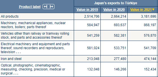 Japonya'dan ithal edilen ilk beş sıraya baktığımızda; (1) makineler, mekanik cihazlar, nükleer reaktörler, kazanlar; bunların aksam ve parçaları, (2) demiryolu veya tramvay vagonları dışındaki araçlar ve bunların aksam ve parçaları, (3) elektrikli makine ve teçhizat ve bunların aksam ve parçaları; ses kaydediciler ve çoğaltıcılar, televizyon, (4) demir ve çelik, (5) optik, fotoğrafik, sinematografik, ölçme, kontrol, hassas, tıbbi veya cerrahi ürünlerini görüyoruz.