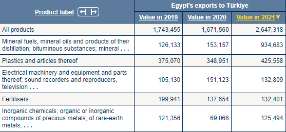 Mısır'dan ithal edilen ilk beş sıraya baktığımızda; (1) mineral yakıtlar, mineral yağlar ve bunların damıtılmasından elde edilen ürünler; bitümlü maddeler; mineral,