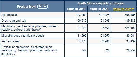 Güney Afrika'dan ithal edilen ilk beş sıraya baktığımızda; (1)Cevherler, cüruf ve kül, (2)Makineler, mekanik cihazlar, nükleer reaktörler, kazanlar; bunların parçaları, (3)Muhtelif kimyasal ürünler, (4)Demir ve çelik, (5)Optik, fotoğrafik, sinematografik, ölçme, kontrol, hassas, tıbbi veya cerrahi ürünleri görüyoruz.