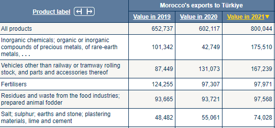 Fas'tan ithal edilen ilk beş sıraya baktığımızda; (1)İnorganik kimyasallar; değerli metallerin, nadir toprak metallerinin organik veya inorganik bileşikleri, (2)Demiryolu veya tramvay vagonları dışındaki taşıtlar ve bunların aksam ve parçaları, (3)Gübreler, (4)Gıda endüstrisi artıkları ve atıkları; hazır hayvan yemi, (5)Tuz; kükürt; toprak ve taş; sıva malzemeleri, kireç ve çimento ürünlerini görüyoruz.