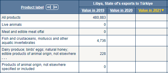 Libya'dan ithal edilen ilk beş sıraya baktığımızda; (1)Canlı hayvanlar, (2)Et ve yenilen sakatat, (3)Balık ve kabuklular, yumuşakçalar ve diğer suda yaşayan omurgasızlar, (4)Süt ürünleri; kuş yumurtaları; doğal bal; Hayvansal kökenli yenilebilir ürünler, başka yerde sınıflandırılmamış, (5)Hayvansal kökenli ürünler, başka yerde belirtilmeyen veya yer almayan ürünleri görüyoruz.