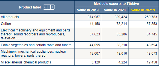 Meksika'dan ithal edilen ilk beş sıraya baktığımızda; (1)Pamuk, (2)Elektrikli makine ve teçhizat ve bunların aksam ve parçaları; ses kaydediciler ve çoğaltıcılar, televizyon, (3)Yenilebilir sebzeler ve bazı kökler ve yumrular, (4)Makineler, mekanik cihazlar, nükleer reaktörler, kazanlar; parçaları, (5)Muhtelif kimyasal ürünleri görüyoruz.