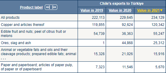 Şili'den ithal edilen ilk beş sıraya baktığımızda; (1)Bakır ve bunlardan mamul eşya, (2)Yenilebilir meyveler ve sert kabuklu yemişler; narenciye veya kavun kabuğu, (3)Cevherler, cüruf ve kül, (4)Hayvansal veya bitkisel katı ve sıvı yağlar ve bunların parçalanma ürünleri; hazır yemeklik yağlar; hayvan, (4)Kağıt ve karton; kağıt hamurundan, kağıttan veya kartondan eşyaları görüyoruz.