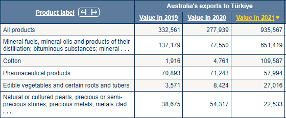 Avustralya'dan ithal edilen ilk beş sıraya baktığımızda; (1)Mineral yakıtlar, mineral yağlar ve bunların damıtılmasından elde edilen ürünler; bitümlü maddeler; mineral, (2)Pamuk, (3)Eczacılık ürünleri, (4)Yenilebilir sebzeler ve bazı kökler ve yumrular, (5)Doğal veya kültür inciler, değerli veya yarı değerli taşlar, değerli metaller, metaller kaplama eşyaları görüyoruz.