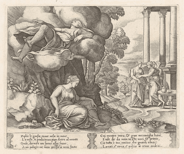 As time went by, Psyche was initially content with her life, but soon she discovered she was pregnant and felt that nothing could mar her happiness. However, she eventually realized that joy is more fulfilling when shared and began to miss her family. She requested her unseen husband, who had warned her that seeing his face would result in him leaving her, to allow her sisters to visit her. After she promised not to heed their pleas or advice, Eros granted her request. Consequently, Zephyrus, the West Wind, carried Psyche’s sisters to the palace, just as he had once transported Psyche.