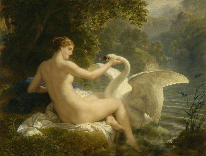 Yunan efsanesine göre Zeus, Sparta Kralı Tyndareus'un karısı olan Leda'yı gördüğünde aşık olur ve saplantı haline getirir. Leda’ya nasıl yanaşacağı hakkında bir süre düşünen Zeus, güzel Leda’yı gölde yıkanırken görür ve kendisini bir kuğu şekline dönüştürerek ona yaklaşmaya çalışır. Leda, bu güzel kuğuya yakınlaşır ve ona yardım etmeye karar verir. Bu sırada, kuğu olan Zeus tarafından ilişkiye zorlanır.