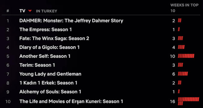 Listenin en başında yer alan dizi 2 hafta da 196 milyon 200 bin izlenme saatine sahip oldu. Bu sayılara yakın izlenme ve ilgiyi Squid Game dizinde görmüştük. Beyaz perdeyle yeni buluşan Dahmer dizisi ise rakiplerinin izlenme oranlarına 4 kat fark atarak yeni bir rekora koşuyor.