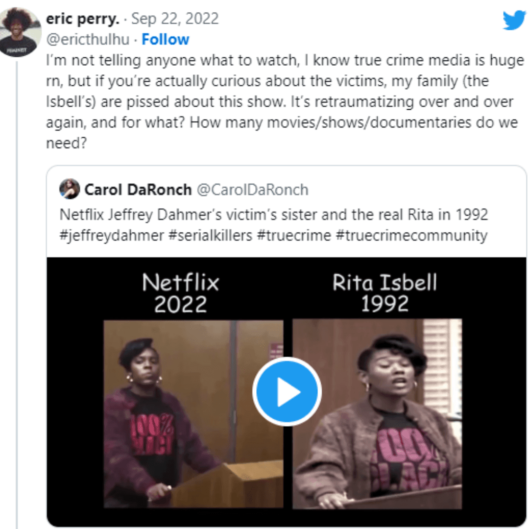 Bu mini dizi ile amaç kurbanlara ses vermek olsa da, Netflix gibi büyük bir izlenme platformunda bu tarz seri katillere yer veriliyor. Sosyal medya da özellikle Tiktok uygulamasında oyuncu Evan Peters ve Seri katil Jeffrey Dahmer'in bulunduğu diziden kısa kareler kullanılarak ve arkaya fon müzik koyularak kısa klipler oluşturuluyor. Yaratıcının niyeti Jeffrey Dahmer'in karakterini çekici kılmak olmasa da bu mutlaka kullanıcılar tarafından çekici bulunuyor.