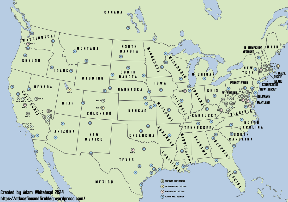 Bir hayran tarafından yapılan sığınak haritası. Açık yeşil onaylanan, turuncu onaylanmayan, kırmızı söylentisi dönen mavi ise planlanan sığınakları temsil etmekte.