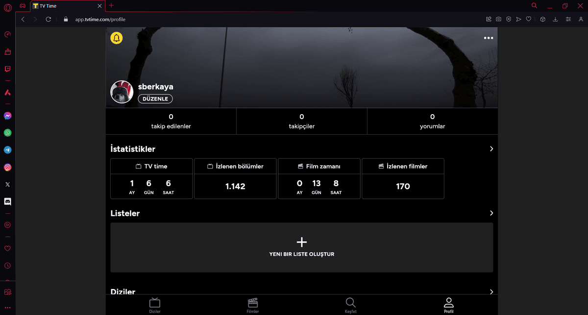 Arayüzün sol üst tarafında kazandığımız rozetler, takip edilen & takipçi ve yorumlarımız ile alakalı bildirimleri görebildiğimiz bir kısım var. Sağ üstten ayarlara, profilmizi paylaşmaya ve yardım merkezine ulaşabiliyoruz. Düzenle kısmından çok profil fotoğrafı, kapak fotoğrafı ve birkaç kişisel bilgi dışında kişiselleştirme seçeneği bulunmuyor. Aşağıya indiğimizde bizim için en önemli kısım olan istatistiklerimiz, oluşturacağımız listeler, izlediğimiz ve listemize aldığımız diziler ile filmler, favori dizi ve filmlerimizi ekleyebilmemiz için de favoriler kısımları bulunuyor. Gördüğünüz üzere dizi ve filmlerin istatistikleri ayrı tutuluyor. Eğer daha önce izlediğiniz bir diziyi veya filmi tekrar izlediyseniz +1 izlenme olarak güncelleyebiliyorsunuz.
