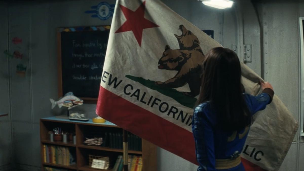 Gelelim eksilere, çok büyük eksiklikler yok ancak her ne kadar ortada bir savaş olduğu belli olsa da bu savaş neden çıktı, ne oldu da insanlık bu hâle geldi bu biraz üstü kapalı kalmış. Belki de ilerleyen sezonlarda bu ve başka konulara yer vererek bu eksiği kapatacaklardır. Örneğin aşağıdaki görselde evrende oldukça önemli bir yere sahip olan New California Republic'e ait bir bayrağa denk geliyoruz. Konuşmanın başında bahsettiğim yazımda bu oluşuma yer vermemiştim çünkü savaştan tam 112 yıl sonra kuruldu. Dizide sadece bayrağını görüyoruz akıbetinin ne olduğuna dair herhangi bir bilgi yok.