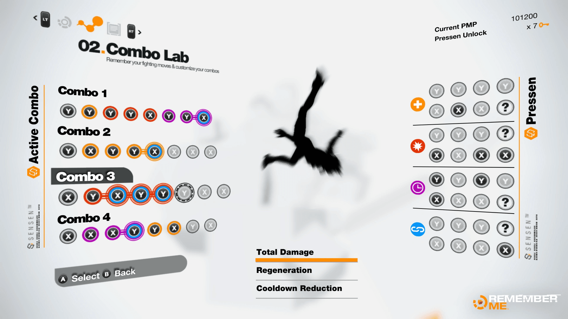 Nilin, elini ve kolunu kavrayan Sensen Glove (Hunt Glove) ile bir çok özel güce sahip olabiliyor. Bu özel güçler hikayenin ilerleyen zamanlarında karşılaştığımız bossları alt ederek kazandığımız güçler. Bununla beraber insanların anılarını çalmamıza yarayan şey de tam olarak bu eldiven. Nilin'in bir Hafıza Avcısı olduğunu söylemiştim. Oyun bize Hafıza Avcıları içerisinde sadece Nilin'in sahip olduğu "remiksleme" yeteneği ile hikaye doğrultusunda birkaç karakterin anılarını kontrol edebilme deneyimi sunuyor. Bu karakterlerin anılarında yaptığımız yanlış hamleler bize kötü sonuçlar getirirken doğru hamleler başarılı olmamızı sağlıyor. Bunun yanı sıra " Nilin'in tek marifeti bu eldiven değil, kendisi güzel de bir dövüşebiliyor aslında. Oyun "Combo Lab" adında bir dövüş sistemi sunuyor. E işin içinde Capcom varken kötü bir dövüş sistemi mümkün mü? Bu dövüş sisteminde dört ana Pressen grubu ve bu gruplara ait farklı hareketler bulunuyor. Dövüş esnasında kazandığımız PMP'ler (combo uzun oldukça düşen PMP sayısı da artıyor) ile farklı hareketleri açarak değişik dövüş stilleri oluşturabiliyoruz. Özel bir eklenti paketi olan "Combo Lab Pack" ile Street Fighter'dan 3 tane harekete sahip olabiliyoruz. Bunlar hareket ve karakter olmak üzere şu şekilde; Spinning Bird Kick - Chun-Li, Flash Kick - Guile, Dragon Punch - Ryu veya Ken. Bunların haricinde 5 farklı S-Pressens bulunuyor. S-Pressens'lar, belirli bir süresi olan ve süresi dolduğunda belirli kombinasyonları bir araya getirince kullanabildiğimiz, Combo Lab ile bağlantısı olmayan ve ona yerleştirilemeyen 5 farklı özel harekettir. 4 ana Pressens grubuna göz atacak olursak: