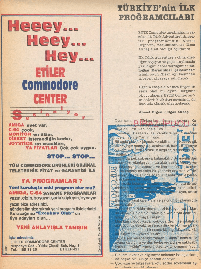 64'ler Dergisi'nin 15. sayısından bir görsel. Araştırdığım zaman o dönem bu gibi dergi, gazete sayfaları ve afişlerin çok yaygın olduğunu gördüm. Eskiden nasıl CD'ciler vardıysa, Commodore Centerlar'da o dönem aynı işlevi görmekteydi. Atari salonlarında oyun oynamanın zevki her ne kadar başka olsa da disket alıp kendi evinde oynayabilmenin verdiği rahatlık o zamanlar insanlar için büyük bir ikilemdi.
