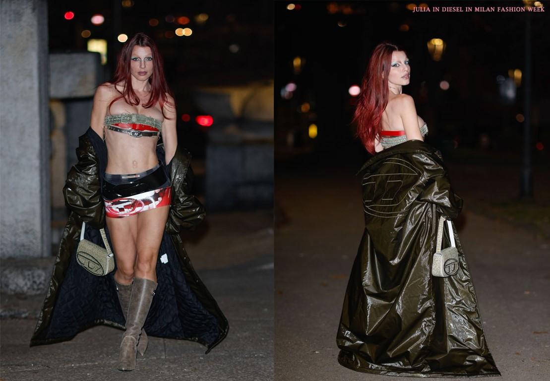 Birinci yazımda Wonyoung'a Miu Miu kızı dediğim gibi Julia'ya da bir marka verecek olsam bu kesinlikle Diesel olurdu. Diesel'in denim, metalik ve deri lookları tam da Julia'nın gündelik hayatında yaptığı kombinlerle matchleşiyor. Çoğu zaman ıslak, metalik görünümlü saçları, deri kıyafetleri ve denim kumaşla yaptığı looklarıyla yiyip bitiriyor. Mesela Milano Moda Haftasında baştan aşağıya giydiği Diesel kombini ilk gördüğümde şakasız sesli bir şekilde ''Slay!'' dedim çünkü sadece kemerlerden oluşan kombini, kızıl saçları ve makyajıyla tam anlamıyla BOMBA bir görünüşe sahipti.
