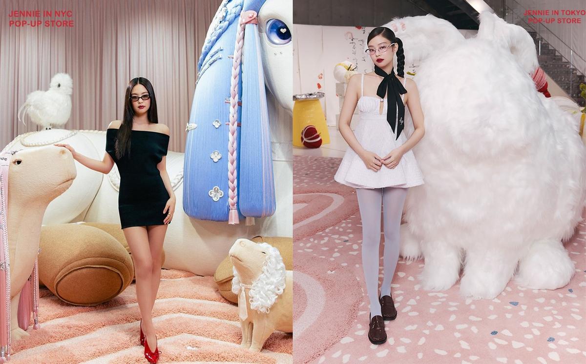 Japonya'daki pop-up store ziyaretinde lokal bir marka olan Her Praha'nın yuvarlak bustiyer elbisesi ve siyah kurdalesini tercih eden Jennie New York'taki pop-up store'da baştan aşağıya marka yüzü olduğu Jacquemus'tan giyinmiş. İki lookunu da da tabi ki gentle monster gözlüklerle tamamlamış.