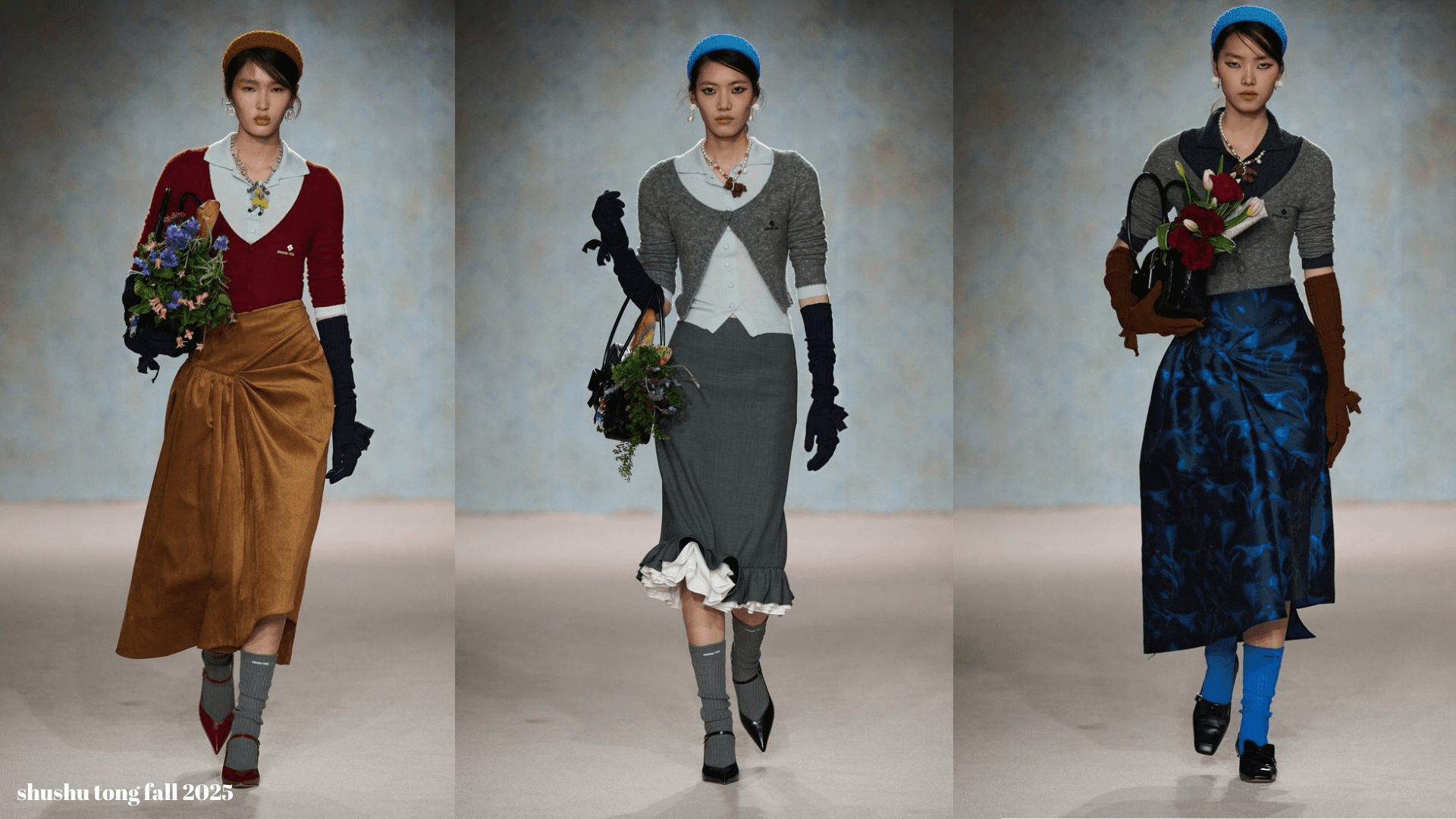 Aslında bu koleksiyon bana, sadece ikiz görünümünden değil, iki farklı karakterden ve iç içe geçmiş çift anlamlardan ilham alınmış gibi hissettirdi. Yani evet, dışarıdan bakınca masum, evcimen ve hafif muhafazakâr bir “Tofaş Annesi” var ama detaylara dikkat ettiğinde fark ediyorsun ki, o gençliğinde mahalledeki karizmatik solcu erkekleri kendine aşık etmiş, saçlarını gizlice boyamış, geceleri rüyasında dünyanın üzerinde oturan asi kız hâlâ orada. Bastırılmamış, sadece dantel yaka altına saklanmış. Renk paletine baktığımızda da zaten hemen bu hissi veriyor: Nostaljik evlerin içinden gelme o toprak tonları, derin yeşiller, açık griler... Sanki salonun perdesiyle koltuk takımını uydurmuşlar. Ya da çeyiz sandığındaki mavi ipek bluzla mutfak dolabının rengi aynı. Ama işte SHUSHU TONG bunu alıp, öyle zekice bir şekilde yorumluyor ki podyumda bu “ev havası” bambaşka bir şeye dönüşüyor. Ayrıca koleksiyonda -ki asla dikkatimden kaçmaz- bir miu miu enerjisi de gördüm. Biliyorum her ''katmanlı giysi'' olayı miu miu'ya özgü değil belki ama...benim aklıma ilk o geliyor. Ki bu detaya da bayıldım. Kalın örme trikolar, düz polo yakalar, uzun etekler....tofaş annelerinin sert bakışları ve çantalarında taşıdıkları çiçekler. Zıt ama birbirini tamamlayan detaylar. Bu lookları aslında istersek biz de yapabiliriz bence. Annelerimizin dolaplarında biraz gezinsek aslında eski bir trikoyu uzun bir etekle matchleştirip giyebiliriz. Tabii bizde de o modellerdeki gibi durur mu bilmiyorum...burada da araya aksesuarlar girer bence. Saç, makyaj ve yeteri kadar takıyla her şeyi başarabiliriz kızlar. İstersek hem bir Shushu Tong kızı hem de bir Tofaş Annesi olabiliriz...