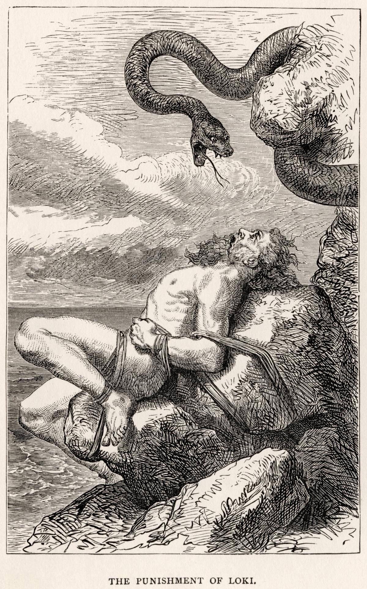 Herkesin çok sevdiği masumiyet tanrısı Baldur'u öldürüp ardından dirilmesini de engelleyen Loki, Odin tarafından bu suçu için cezalandırılır. Önce oğlu Narfi öldürülen tanrı, bir kayaya bağlanır ve başının üzerine de durmaksızın zehir damlatan bir yılan konur. Loki'ye değen her bir zehirli damla tanrıya dayanılmayacak bir acı verir. Bu acıyla kıvranan Loki her bağırdığında ise depremlerin meydana geldiğine inanılırdı. Loki'nin bu cezası ise, masumluğa ve iyiliğe yapılan hiçbir kötülüğün cezası kalmayıp en acı sekilde karşılığının verileceğine dair olan inancı simgeler diyebiliriz.