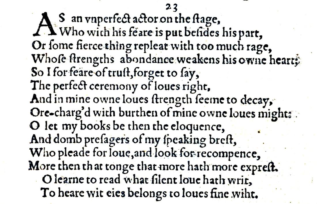 In this sonnet, we can see there’s a simile. In the first and second quatrain, the speaker describes himself as an inexperienced actor on the stage who is too excited and fearful to say his lines. This simile refers to his inability to confess his love out loud. He wants to confess his love deeply, but his love is too overwhelming to speak, he’s melting down his love that’s why he’s afraid to forget what he wants to say. In the third quatrain, he decides writing is the best way to express his feelings to his beloved one. In the couplet, he says, ‘’ O learn to read what silent love hath writ / To hear with eyes belongs to love’s fine wit’’ (Shakespeare 23). When I read these lines, I felt how powerful art truly is. He says to his beloved one that he should learn how to read silent love; it means, he should read his writings and see his love for him which he can’t say out loud because he confesses his love through his poem, he speaks with his art. When I saw the simile of an ‘actor’ in this sonnet, I thought it might be related to Shakespeare’s personal life. He was also an actor, and he knew the feeling of being on the stage for the first time. I think he might have felt the same way being an amateur actor and a lover as they both have to express themselves with speaking, but they both forget what to say with the burden of excitement and the fear of being on the stage or confessing his feelings in front of his love for the first time.