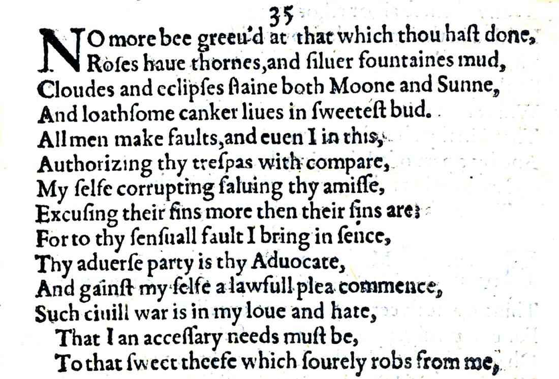 I suppose this sonnet is one of the strongest sonnets which have an inner emotional conflict of the speaker. He knows what is right, but he doesn’t want to accept it and it ties him up in knots. He starts by saying he’s not sad anymore about the bad things that his loved one has done in the past, or he might do in the future. He’s aware that he’s been betrayed, but he’s still making excuses to forgive his love. In this sonnet ‘The Youth Fair’ is not as innocent as in Sonnet 20 as he stained this relationship with betrayal. However, the speaker is so in love that he tries to forgive his/her by saying all men can make mistakes and even he says he’s a man who makes mistakes with these lines: ‘’All men make faults, and even I in this / Authorizing thy trespass with compare / Myself corrupting, salving thy amiss’’ (Shakespeare 35). It seems to me he’s kind of criticizing him/her and himself like; ‘’Yes you made mistakes and I make mistakes too by trying to forgive a person like you who betrays to his/her lover.’’ He himself knows it is a mistake to forgive him/her, but he’s blinded by his beloved one’s beauty and love so that he’s saying all beautiful things in this world have flaws with these words: ‘’Roses have thorns and silver fountains mud’’ (Shakespeare 35). In the end, he blames himself because he’s the only one who let him/her have a place in his life so he’s the only guilty person and, he deserves the bad things his lover had done since he let him/her do them with loving him. From my standpoint, he’s trying to cover up his lover's mistakes by making himself the actual guilty one. In the couplet, he’s aware that his love is being used but he consents to it and keeps loving him/her as well as he forgives all mistakes that his lover has made because he/she deserves to be tolerated no matter what he/she has done, or might do.