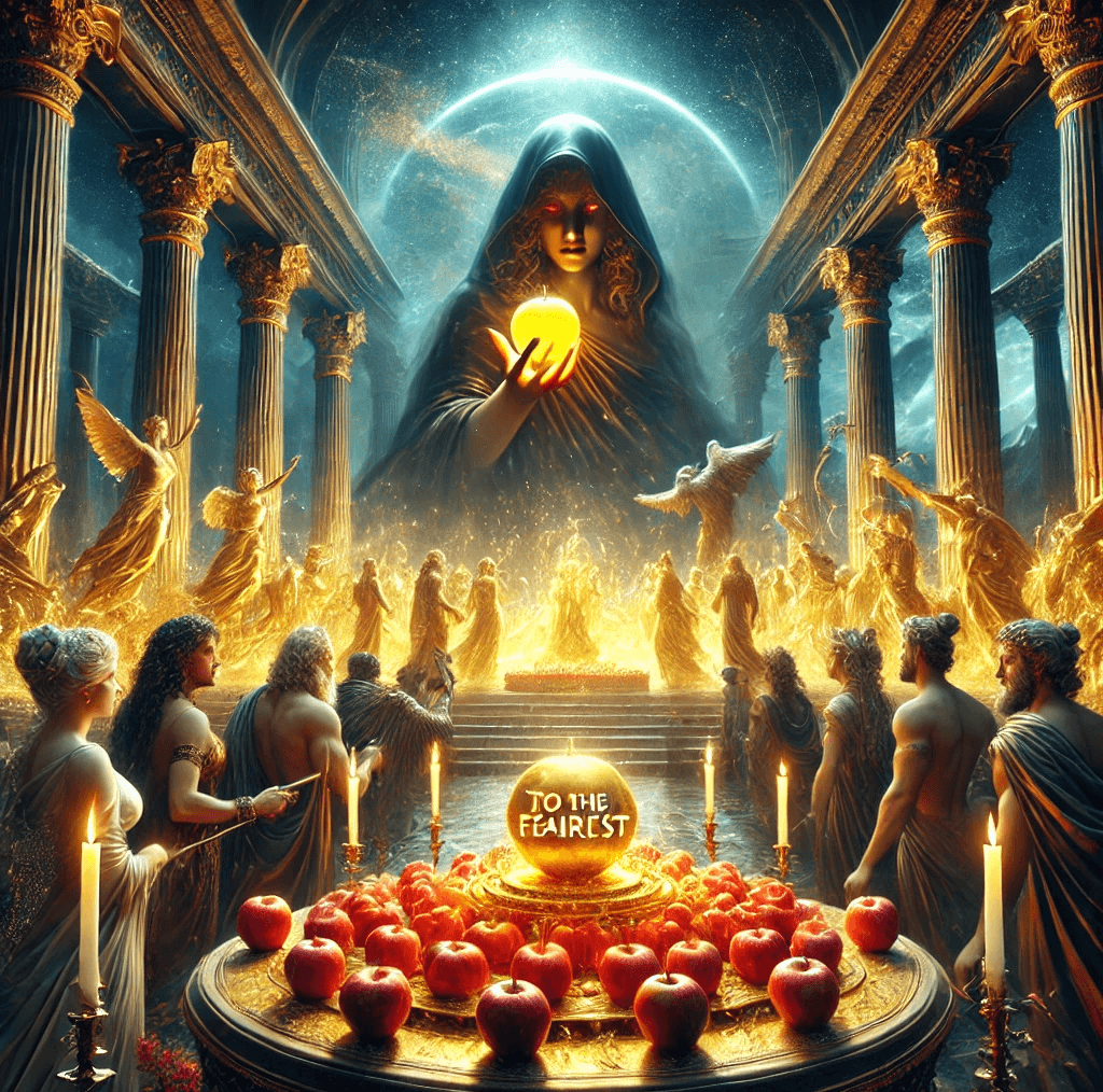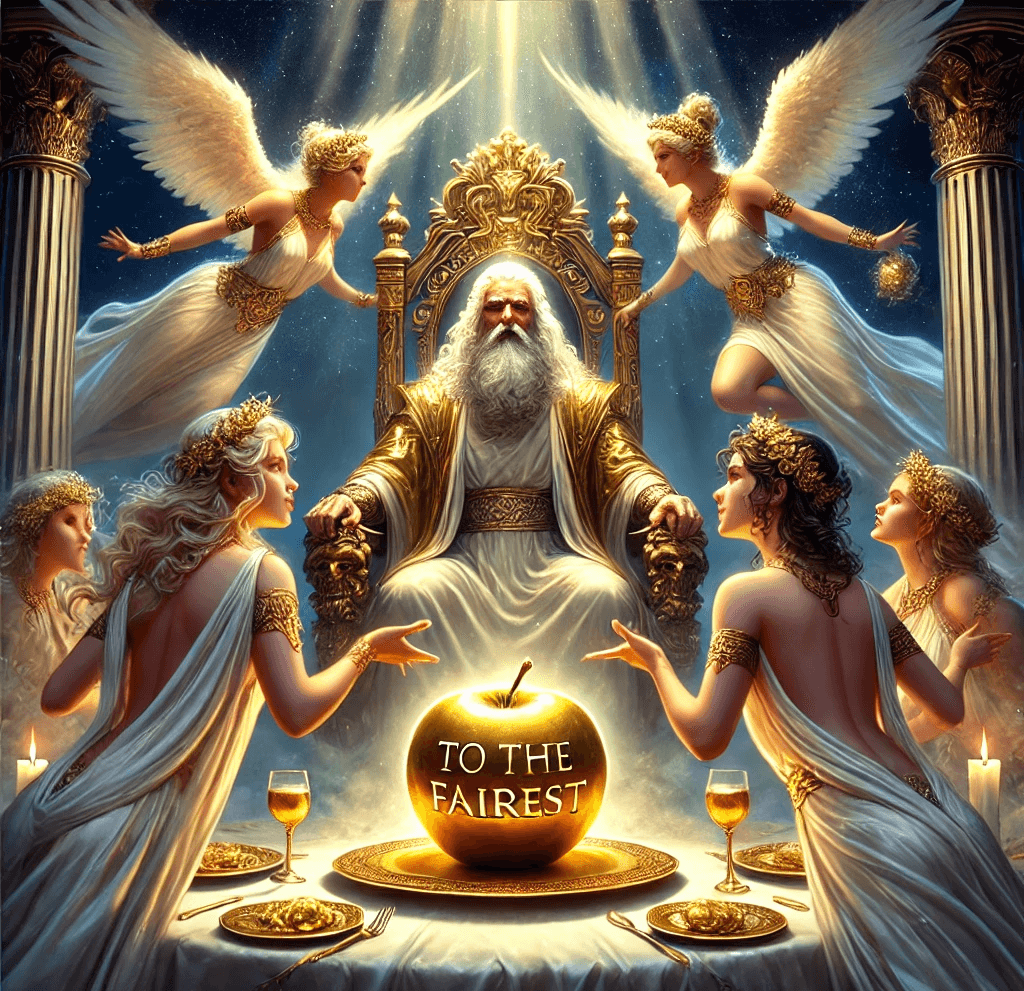 Altın renkli çekici bir elma hazırlar ve bu elmanın üstüne en güzele yazar. Hazırladığı bu elmayı düğünün ortasına fırlatır. Zekâ ve akıl tanrıçası Athena elmanın ona geldiğine inanırken tanrıça Hera kendisine geldiğine inanır. Güzellik tanrıçası Afrodit ise bu elmanın diğerlerinden herhangi biri için gelmediğine aslında kendisi için geldiğine inanır. Bu üç önemli tanrıca başlarlar bir tartışmaya. Durum içinden çıkılmaz bir hale gelince Zeus’tan yardım isterler. Zeus ise çok arada kalır. Karısını seçerse diğerleri öfkelenecek diğerlerini seçerse karısı öfkelenecekti. Zeus bu sebeple bitli yorganı üstüne almaz ve bu kararı vermesi için bir ölümlüyü seçer. Bu kişi de Truva prensi Paris’tir ama Paris’in Truva prensi olduğundan haberi yoktur. Şimdi biraz eskilere gidelim ve Paris’in bu durumdan neden haberdar olmadığını anlayalım.