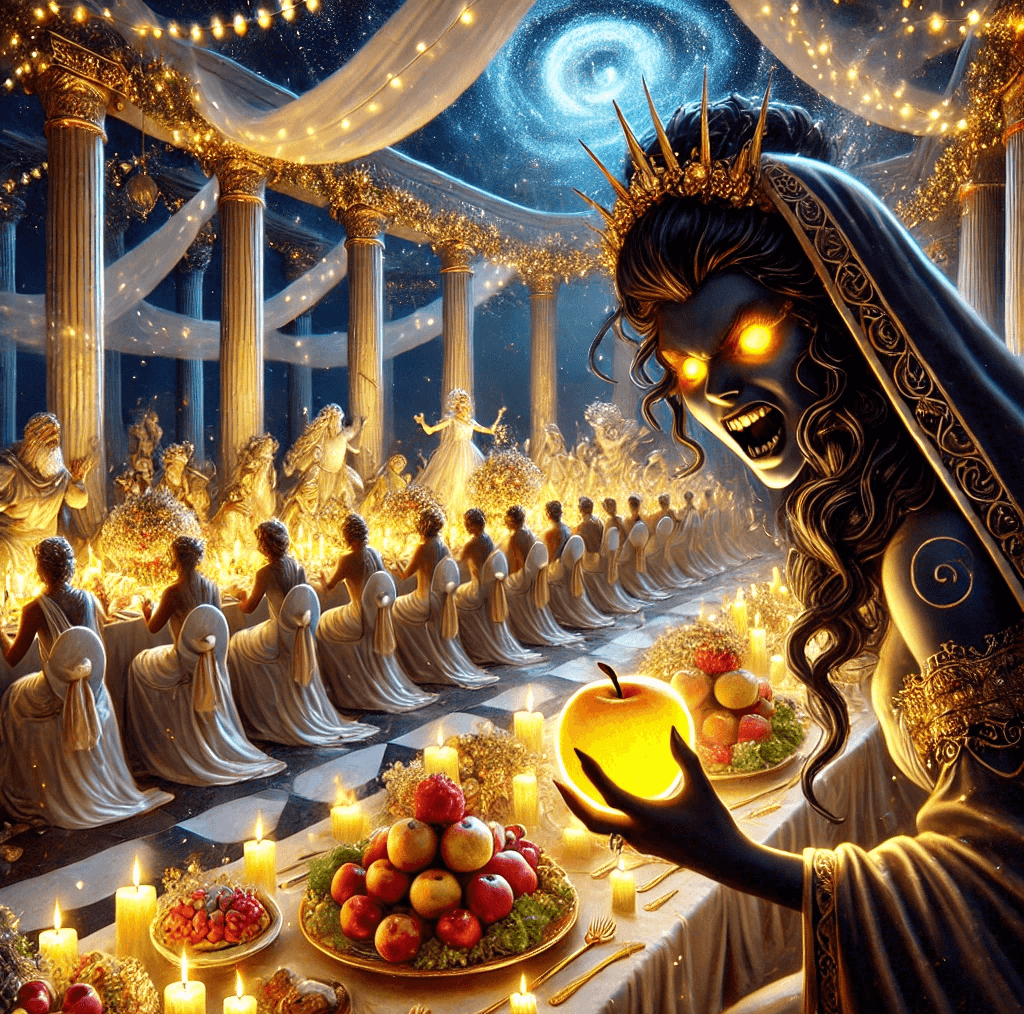 Günlerden bir gün Olympos dağında tanrıça Thetis ile Peleus’un düğünü vardır. Bu görkemli düğüne bir kişi hariç herkes çağırılır. O istenmeyen misafir ise nifak ve kötülük tanrıçası Eris’tir. Zeus onun düğünü bozacağını düşündüğünden onu ortamda istemez. Fakat kötülük tanrıçası bu durur mu? Çağrılmadığını fark ettiğinde kızgın bir lav kadar öfkelenir ve onu çağırmadıklarına pişman edecek bir plan hazırlar.