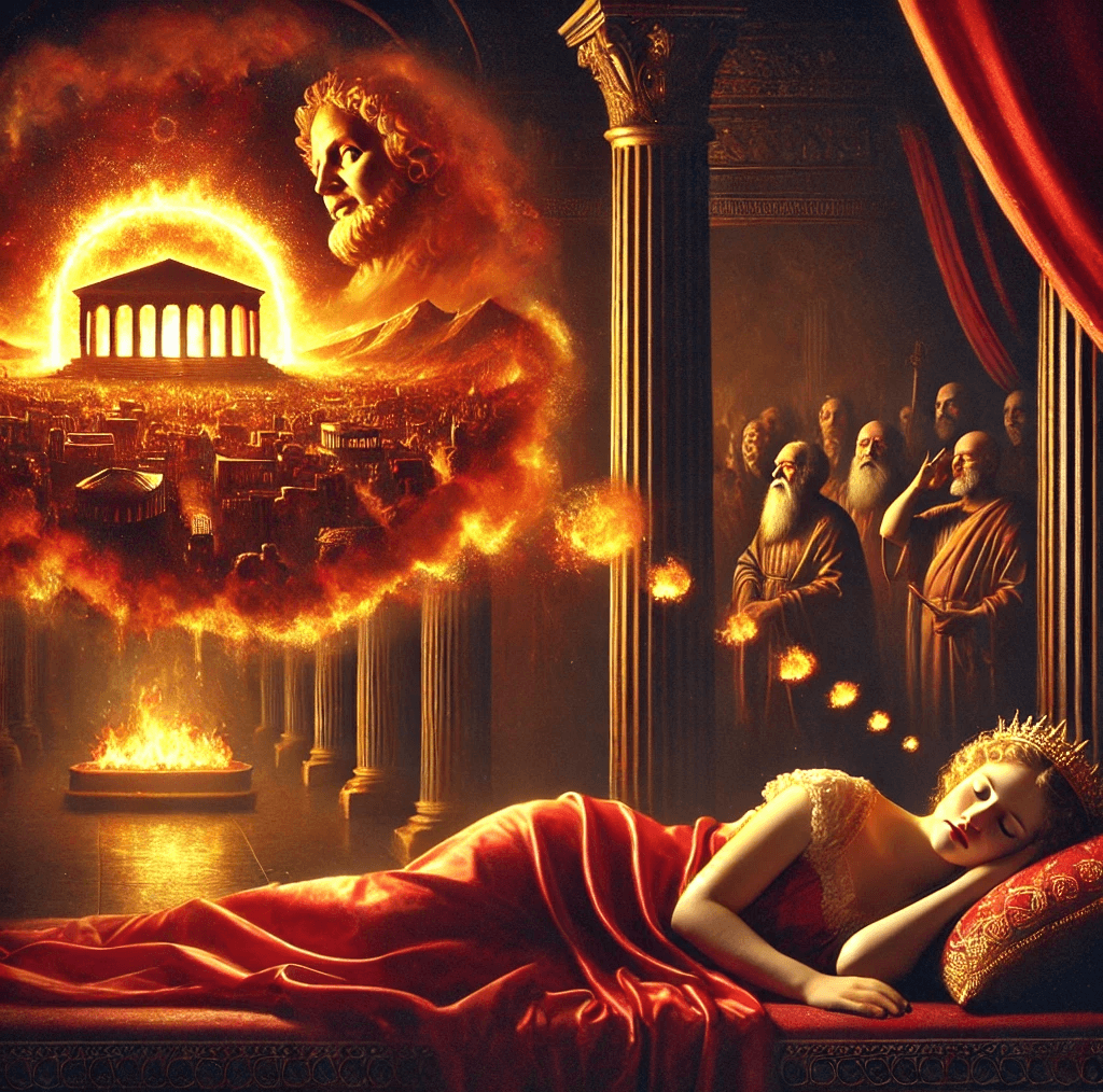 Günlerden bir gün Truva kraliçesi Hecabe Paris’e hamileyken bir rüyaya dalar. Rüyasında karnından bir alev topu çıktığını ve bu alev topunun tüm Truva’yı yıkıp küle çevirdiğini görür. Hemen kahinlerin yolu tutulur ve rüya anlatılır. Bunun sonucunda korkutucu kehanet ortaya çıkar. Kahinlerin söylediğine göre doğacak çocuk Truva’nın sonunu getirecektir. Elbette bu haber halk arasında yayılır ve halk bu durumdan endişelenir. Bunun sonucunda kral Priamos ile kraliçe Hecabe doğan bebeği kaz dağlarında ölüme terk eder.