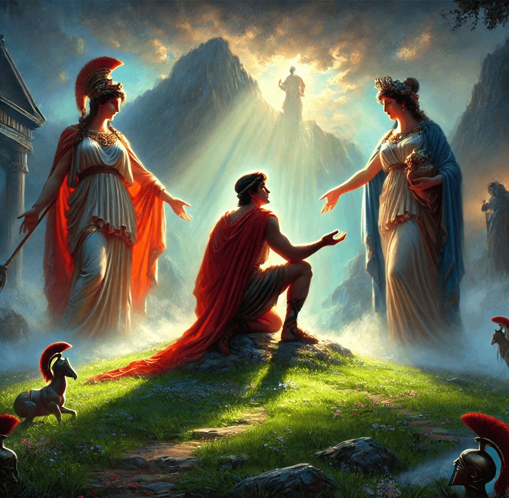 Fakat her zaman söylediğimiz gibi kaderden kaçılmaz. Bu yeni doğan bebeği çobanlar bulur ve onu da çoban olarak yetiştirirler. İşte elmanın sahibine karar verecek olan kişi Truva prensi olduğundan habersiz olan Paris’tir. Karar Paris’e kalınca tanrıçalar hemen onu bulur. Her birinin farklı vaadi vardır. Eğer seçilirse Athena sonsuz zekâ vereceğini Hera ise sonsuz zenginlik ve kuvvet vereceğini söyler. Bunların yanında Afrodit çok daha cazip bir teklif sunar: tüm diyarların en güzel kadını Helen’i ona ulaştırmak. Paris elbette Afrodit’in teklifini kabul eder. Hera ve Athena bu yenilgiyi kabul edemez.