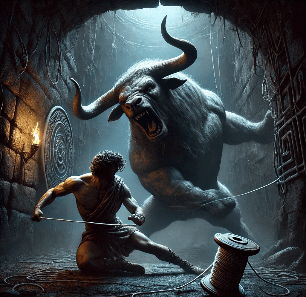 Artık adımlarını emin bir şekilde atıyordu ve işte Minotor’u uyurken buldu. Üstüne düştüğü gibi onu yere neredeyse sabitledi ve silahı olmadığını için yumruklarıyla öldüresiye dövmeye başladı. Theseus o zorlu mücadeleyi kazandıktan sonra hemen ip yumağını eline aldı ve çıkışı kolaylıkla buldu. Diğer kurbanları ve Ariadne’yi de yanına alarak gemiyle birlikte Atina’ya doğru yola çıktılar.