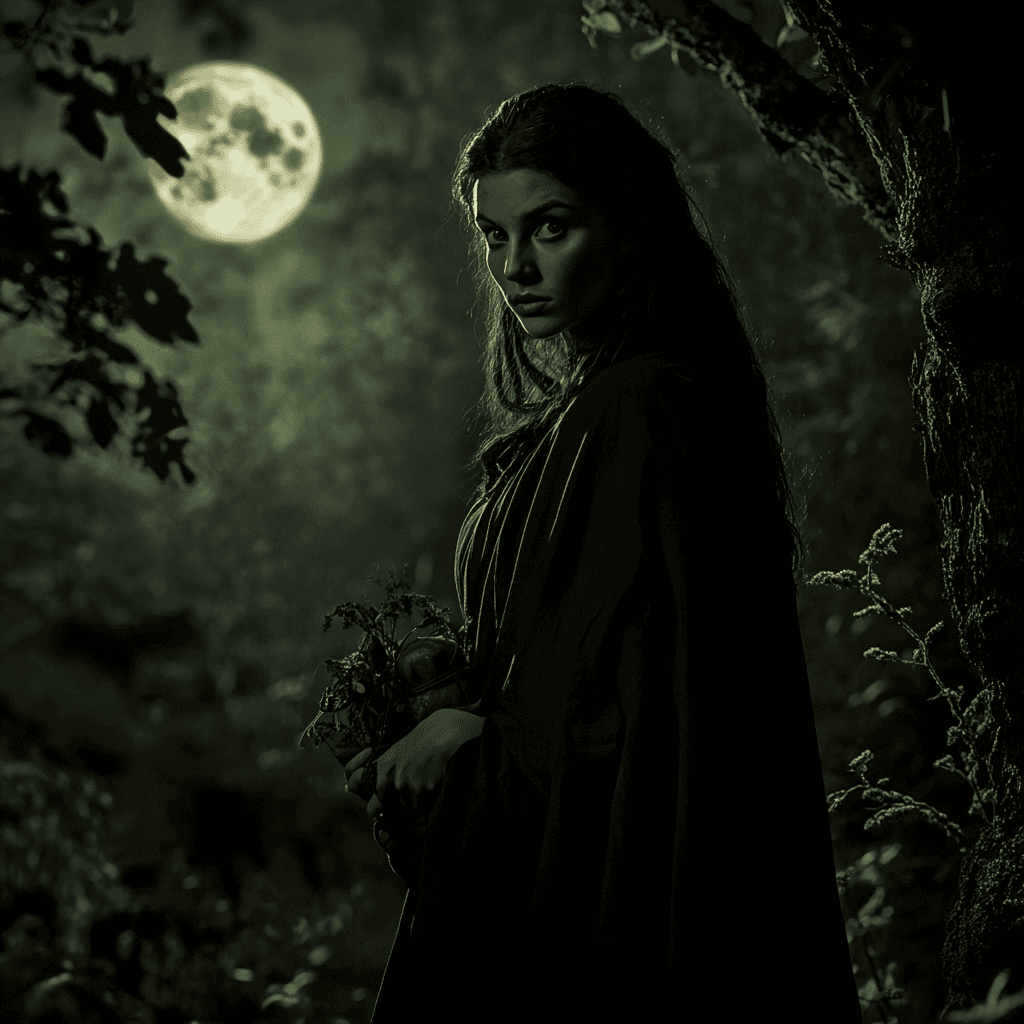 ( Ay ışığında tek başına yürüyen ve cadı olduğu düşünülen bir kadın, bu fotoğraf yapay zeka ile oluşturuldu.)