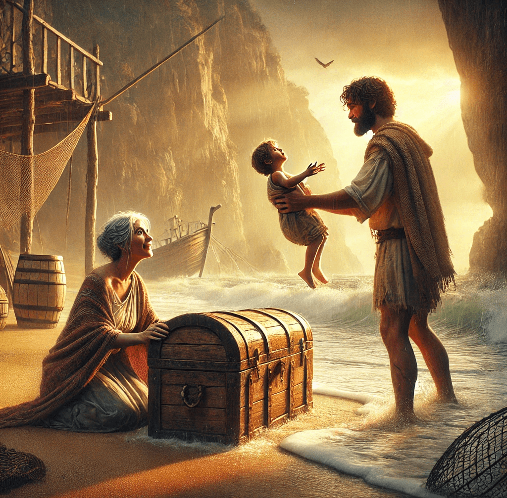 Danaë küçücük oğluyla sandığın içinde oturuyordu ve denizin ortasında yapayalnızlardı. Gün ışığı yavaştan yok oluyordu ve Danaë gece boyunca sallanan sandığın içinde sanki üzerlerine gelip onları ıslatacakmış gibi hissettiren dalgaların sesini dinledi. Günün aydınlanması onun için umut kaynağı olamıyordu çünkü zaten sandığın içinde gün ışığını göremiyordu. Aslında etrafında bir sürü ada vardı ama bunların hiçbirinden haberdar olamıyordu. Sadece bir an dalganın onları alıp bir yere fırlatacağını hissetti ve öyle de oldu. Dalgaların yardımıyla bir kıyıya vurdular ama hala sandığın içinden kurtulamamışlardı ve kurtulmak için hiçbir yolları da yoktu.