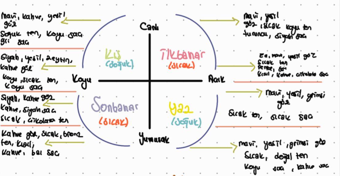 En son yazımızı bu tablo ile bitirmiştik, şimdi ise bu tablo ile başlamamız gerekiyor. Anlattığımız gibi koyu kış, canlı kış – koyu sonbahar, yumuşak sonbahar, açık ilkbahar, canlı ilkbahar ve yumuşak yaz, açık yaz vardı. Eğer cilt altı tonunuzu bulduysanız şimdi gelin bunu nasıl değerlendireceğinizi öğreteyim.